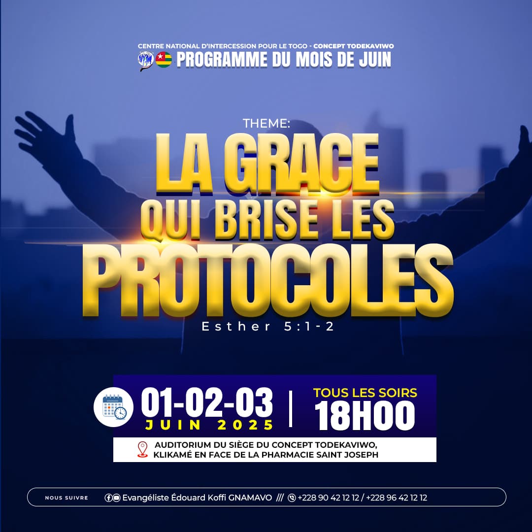 Lieu : Centre National d’Intercession pour le Togo, siège du Concept TODEKAVIWO sise à Bè-KLIKAME, en face de la pharmacie Saint joseph.